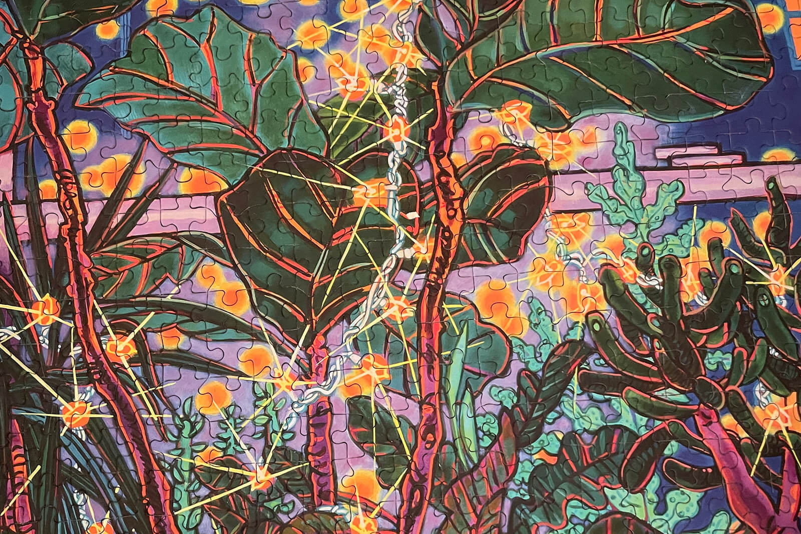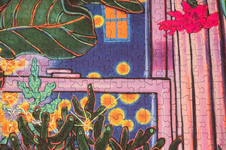 This painting captures a delightful, intimate scene directly inspired by the artist's life: "Over many years, we have accumulated a number of sentimental house plants... We decorate them around New Years and throw them a party." This unique puzzle makes a fantastic gift for adults and a collector's item for art enthusiasts.